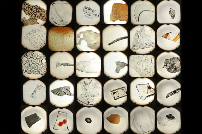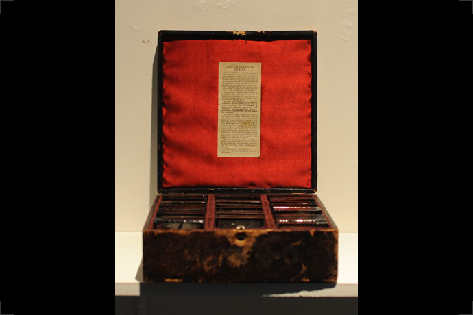 Thirty pieces of glasses are randomly picked up around glass studios at RISD. Accidents arose in dynamic glass making processes allow me to seek out uncanny images manifested in glass pieces. Each piece is molded with epoxy into slides. They are placed into a box, which was originally filled with optical laboratory glass filters. |