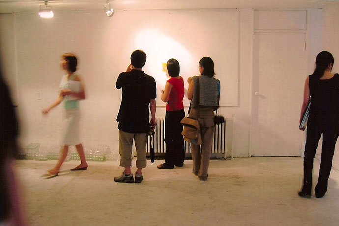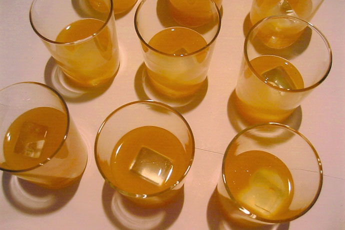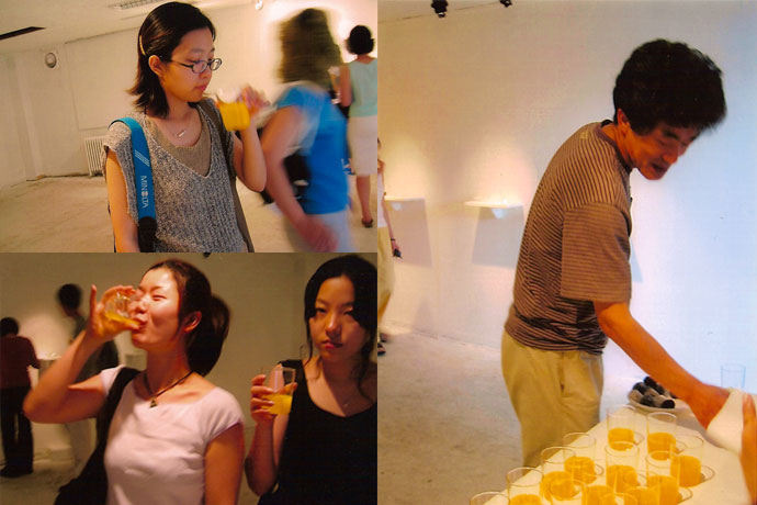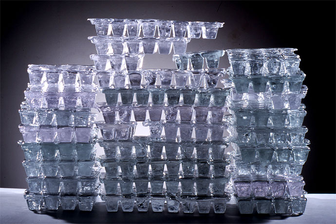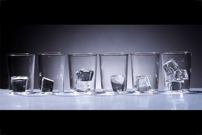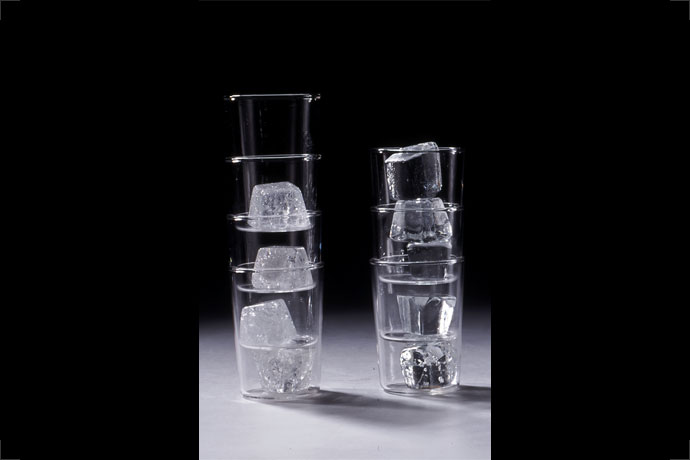 - glass cracked and non-cracked, are made and glued onto cups. Warm drinks are prepared in these cups for my art show: carbonated drinks with cracked glass-ice, and water and juices with non-cracked. drinks always follow. People often hold onto their drinks as they enjoy art works displayed. the drinks were until they finished drinking and saw the ice cubes were not real. This work is made as a performance piece to bring an issue of typical behaviors. |