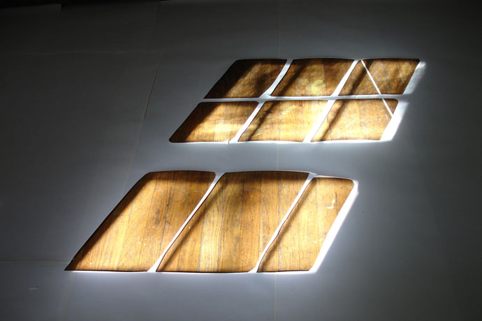 Paper cut is made along the edges of the tree shadows, exposing the wooden floor underneath.
